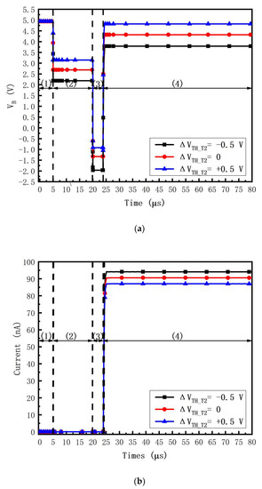 Figure 5c shows the transient waveforms of CER vary when ΔVTH_T2 is +0.5 V and −0.5 V, respectively. It is found that the CERs are less than ±9.59% within the whole data range. Thus, the threshold voltage variation ΔVTH_T2 is compensated successfully.