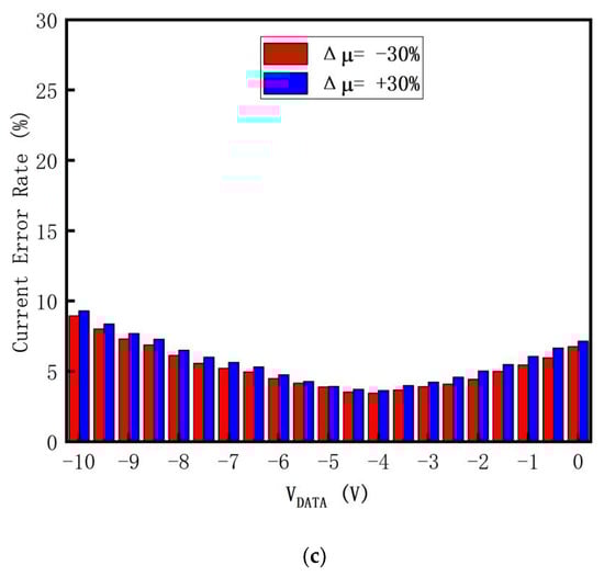 Figure 6a shows the transient waveforms of VB at VDATA = −4V. It is found that when Δu= ±30%, the variation of VB is similar to Δu, i.e., VB senses the mobility variation successfully. Figure 6b shows the transient waveforms of the OLED current IOLED. It is found that IOLED = 0 except for the emission stage, i.e., the OLED flicker is prevented. In the emission stage, when Δu = −30, 0, and +30%, the transient waveforms of IOLED = 88.06, 90.59, and 93.87 n A, respectively. The current error rates are 2.81% and 0, 3.49%, respectively. Thus, the circuit compensates Δu successfully.