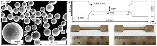 (a) Surface morphology of the 17-4PH steel powder; (b) scheme of the tensile test specimens used for the SLM fabrication.