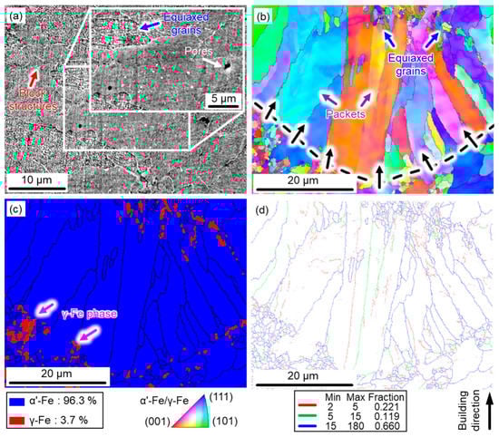 Figure 2 presents the microstructure features and phase distribution of the as-built 17-4 PH steel along the building direction. The as-built samples were crack-free, and only a few tiny pores (white arrow) were observed in Figure 2a. Block structures (red arrow) consisting of numerous equiaxed grains (blue arrow) were the main features of the microstructure of as-built samples. Combined with the orientation map and phase distribution map (Figure 2b,c), each packet (purple arrows in Figure 2b) included several blocks that were composed of martensite laths with different misorientations. Moreover, a typical epitaxial growth of the coarse columnar structures (black arrows in Figure 2b) dominated the microstructure of the melt pool boundary of the as-built samples. This solidification mode was driven by the ratio of the thermal gradient (G) and cooling rate (R). Specifically, a large ΔG and a low R existed at the molten pool boundaries near the solidified components, leading to the growth of columnar dendrites perpendicular to the boundaries of the molten pool.