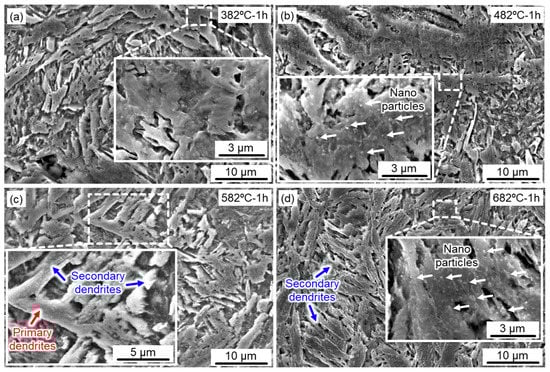 Moreover, the critical effect of aging treatment is the generation of dispersive nano-Cu particles within the martensite matrix to enhance its material properties [33]. Nanoparticles were scarcely observed within the aged samples at 382 °C for 1 h, while the quantity of precipitated nano-Cu particles (marked by white arrows) swiftly increased with the rising temperature (from 482 °C to 682 °C). Particularly, numerous nano-Cu particles were detected in the aged samples treated at 682 °C for 1 h (Figure 3d). Overall, although the lath width treated at 382 °C was not obviously coarsened, there was no effective precipitation hardening effect (i.e., very few nano precipitates), indicating an under-aging state. After aging above 582 °C, large quantities of nanoparticles were evenly distributed in the matrix, but the lath width was clearly coarsened, biasing towards an over-aging state. Therefore, the 17-4 PH steel, after holding at 482 °C for different times, will be explored in the following section, taking into account the microstructure and the number of precipitated nanoparticles.