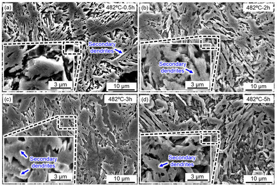 To discuss the microstructural evolution during the aging treatment, high-magnification SEM images of the aged samples under different holding times are displayed in Figure 4. Typical lath-like martensite with coarsened secondary dendrites was clearly detected (marked with blue arrows), particularly for long holding times (Figure 4c,d). The strength and hardness of under-aged 17-4 PH steel were restricted despite the fact that the microstructure coarsening caused by short-term aging treatment was not obvious. Long-term aging treatment was beneficial to the precipitation and growth of the nanoparticles, but the coarsened lath martensite greatly reduced its mechanical properties. Therefore, it is extremely significant to seek a desirable combination of the aging temperature and time.