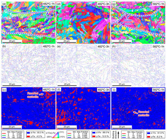 EBSD characterizations of the SLM 17-4 PH steel samples under different conditions: (a–c) aged samples at 482 °C for 1 h; (d–f) aged at 482 °C for 3 h; (g–i) aged at 582 °C for 1 h. IPF images are shown in the first row, grain boundary distribution in the second row, and phase mapping in the third row.