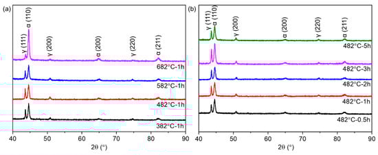To further identify the phase distribution, XRD analysis was conducted on the SLM 17-4 PH steel under different aging states. As shown in Figure 6, the dominant phase compositions of the aged samples were α’-Fe phase (JCPDS # 06-0696) and γ-Fe phase (JCPDS # 23-0298). Figure 2c shows that the SLM 17-4 PH samples in the as-built state were mainly composed of the α’-Fe phase with a BCC structure and a small amount of γ-Fe phase with a FCC structure. Notably, the γ-Fe phase within the as-built samples did not exclusively include the retained austenite (i.e., γ-Fe phase) due to an incomplete transformation of austenite to martensite at a high temperature. The samples also included reverted austenite (named γ’-Fe phase to show this distinction) caused by the IHT effect during the SLM. After being processed by the aging treatment at various temperatures (Figure 6a) and times (Figure 6b), the reverted austenite with an FCC structure was rapidly formed alongside numerous nano-Cu particles. In short, phase transition within the aged samples can be described as follows: