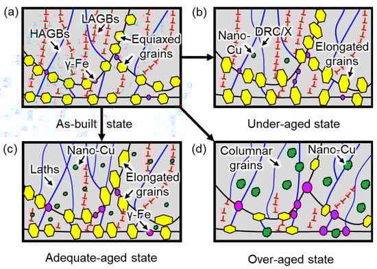 Typical microstructural evolution of the different aged states: (a) as-built; (b) under-aged; (c) adequate-aged; (d) over-aged.