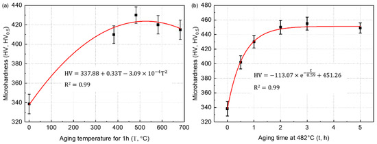 As for the effect of the aging time on the microhardness of the aged samples (Figure 8b), the microhardness also first increased, then remained roughly unchanged. The maximum value (455 ± 8.9 HV0.5) occured within the 482 °C-3 h aged samples. The function of microhardness (HV, HV0.5) vs. aging time (t, h) can be concluded as follows: