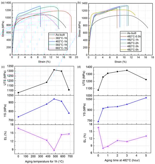 Figure 9a,b illustrates the strain-stress curves of the SLM 17-4 PH steel samples under different aging conditions, and the variations of tensile performances are summarized in Figure 9c,d, including ultimate tensile strength (UTS), yield strength (YS), and elongation to break (EL). As can be seen in Figure 9a,c, both the UTS and YS gradually increased withthe prolonged aging temperature at 1 h aging time. The UTS reached its peak value at the aging temperature of 482 °C, which was similar to the trend in microhardness. The ductility decreased rapidly (i.e., EL = 8.8%) when the aging treatment was conducted on the SLM 17-4 PH steel at 482 °C, despite having the highest strength (i.e., YS = 939.7 MPa and UTS = 1312.8 MPa) among the tested steel samples. Thus, the aging temperature should preferably be 482 °C if the strength is the optimization goal.