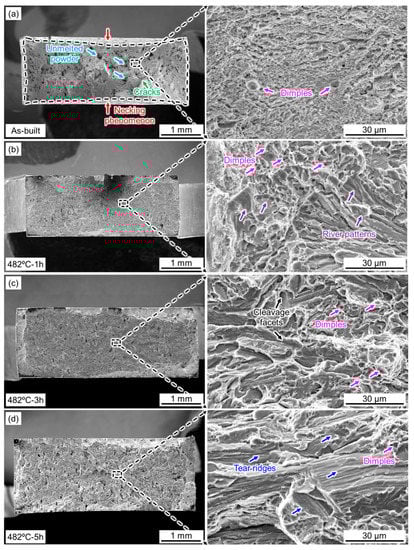 Fractographic features of the SLM 17-4 PH steel samples under different conditions: (a) as-built; (b) aged at 482 °C for 1 h; (c) aged at 482 °C for 3 h; (d) aged at 482 °C for 3 h.