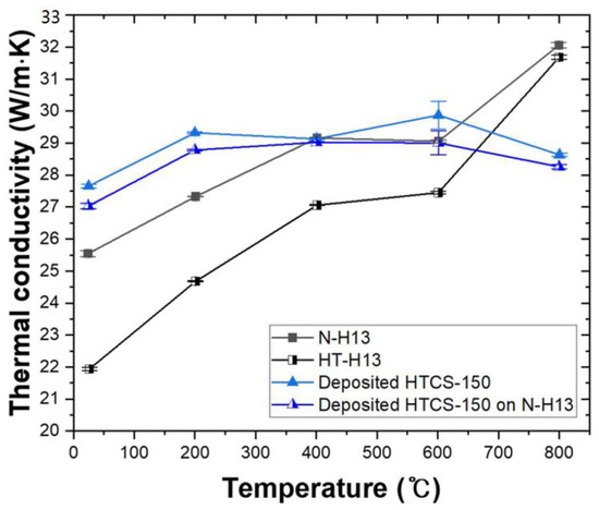- The HTCS-150 deposited via the powder-fed DED process showed a higher thermal conductivity than N-H13 and HT-H13 up to 600 °C, and its thermal conductivity was relative stable up to 800 °C. It is attributed that the large number of interfacial carbides and molybdenum composition in the HTCS-150 leads to a higher thermal conductivity than N-H13 and HT-H13.