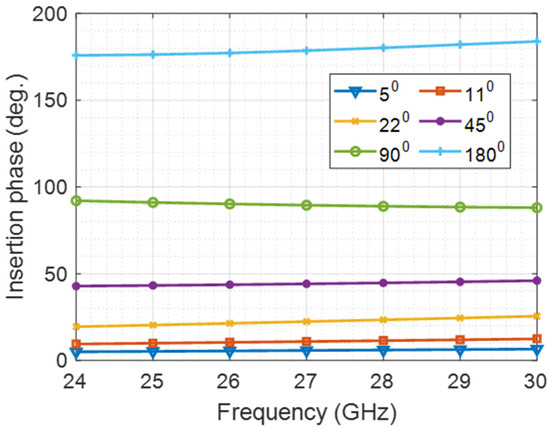 To perform hybrid beamforming, numerical scattering parameters are exported from the full-wave simulator and subsequently processed using the Phased Array System Toolbox in MATLAB. The proposed design alternates cascade passive switched-LC phase shifter cells to result in 6-bit phase control. The practical cascading of the designed 6-bit phase shifters will not be similar to an ideal phase shifter. The 64-phase states are then combined with our custom code to create analog beamformers based on a practical circuit phase shifter, as illustrated in Figure 4.
