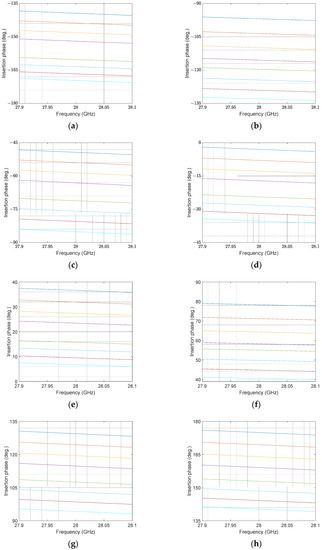 Simulated phase shifter in all 64 phase states for 6-bit phase shifters, corresponding to phase shift of: (a) −180°–−135° (b) −135°–−90° (c) −90°–−45° (d) −45°–0° (e) 0°–40° (f) 40°–90° (g) 90°–135° (h) 135°–180°. Different colors in each figure correspond to 8 different phase levels.