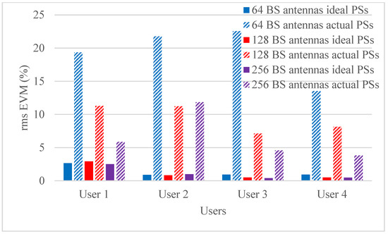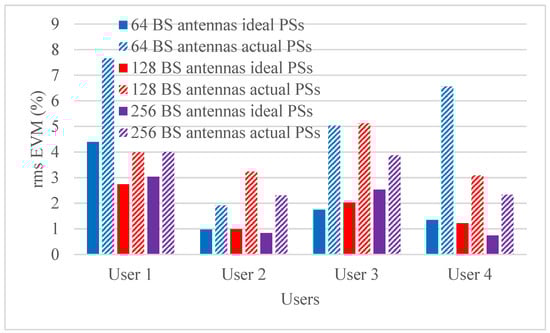 RMS EVM values of multiple data streams for actual and ideal phase shifters using a 16-QAM scheme and multiple BS antennas for four users when using four receiver antennas.