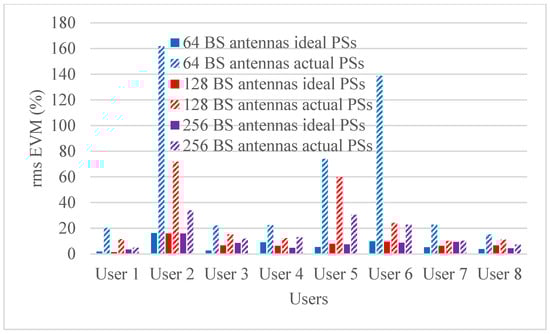 RMS EVM values of single data stream for actual and ideal phase shifters using the 16-QAM scheme and multiple BS antennas for eight users when using four receiver antennas.