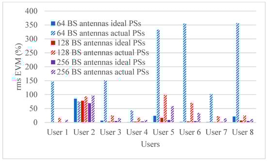 RMS EVM values of multiple data streams for actual and ideal phase shifters using a 16-QAM scheme and multiple BS antennas for eight users when using four receiver antennas.
