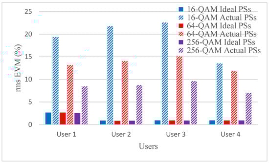 RMS EVM values of multiple data streams for actual and ideal phase shifters using M-QAM schemes and 64 BS antennas for four users when using four receiver antennas.