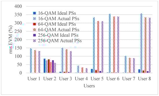 Figure 10 and Figure 11 illustrate the RMS EVM values of the 64 BS antennas for multi-user massive MIMO systems with various modulation schemes for four and eight users, respectively. It is noted from the results that for the four users, the RMS EVM performance improves significantly when the number of M-QAM modulation schemes is increased in the actual phase shifters. However, the RMS EVM is slightly improved for the ideal phase shifters. Similar behavior is noted for eight users with slightly improved RMS EVM. In general, increasing the number of M-QAM modulation schemes improved the RMS EVM performance.
