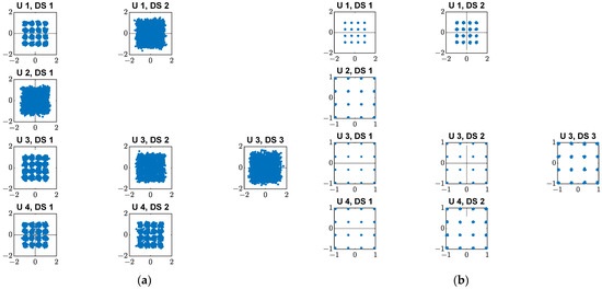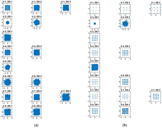 The equalized symbol constellations per data stream for both actual and ideal phase shifters with 64 BS antennas for four users with multiple data streams for the 16-QAM modulation scheme are depicted in Figure 12a,b, respectively. Figure 13a,b illustrate the equalized symbol constellation for both actual and ideal phase shifters with 64 BS antennas for eight users with multiple data streams for the 16-QAM modulation scheme, respectively. It can be noticed that for the same user, the variation of the recovered data streams is high for the actual phase shifter compared with the ideal phase shifter.