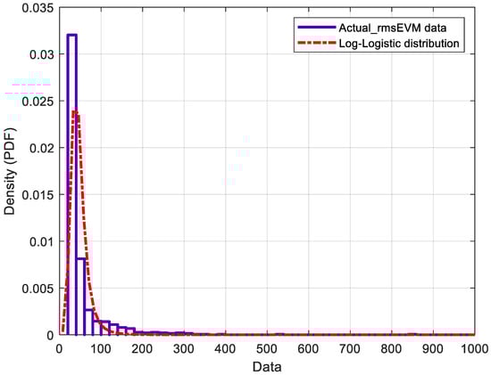 The RMS EVM distributions are a critical measure of performance for multi-user massive MIMO hybrid beamforming systems. They are impacted by the number of users, modulation scheme, mobile stations’ locations, and other factors. Here, we investigate the distributions of RMS EVM for ideal and actual phase shifters. The number of OFDM data symbols used in this simulation is ten for eight users, 16 QAM modulation schemes, −25 dB SNR, 120 simulation runs, and 170 h runtime. Investigating the obtained results, it is found that the actual RMS EVM distribution is different from that of the ideal RMS EVM. Table 2 shows the log-likelihood of different distribution types. It is clear that the minimum log-likelihood of the actual RMS EVM distribution is the log-logistic distribution, whereas the logistic for both ideal RMS EVM distribution is the difference between actual and ideal.