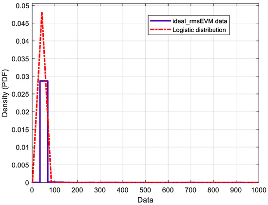Figure 14 shows that the RMS EVM distribution of the actual phase shifter agrees with the log-logistic theoretical distribution. The log-logistic distribution, on the other hand, is produced by applying the logarithmic transformation to the logistic distribution in the same way, such that the log-normal distribution is produced from the normal distribution. The ideal RMS EVM distribution is also similar to the theoretical distribution of logistics shown in Figure 15. The logistic distribution is utilized in different growth models, as well as in some regression schemes. The standard logistic distribution represents a continuous distribution on R, with distribution function G given by [57]