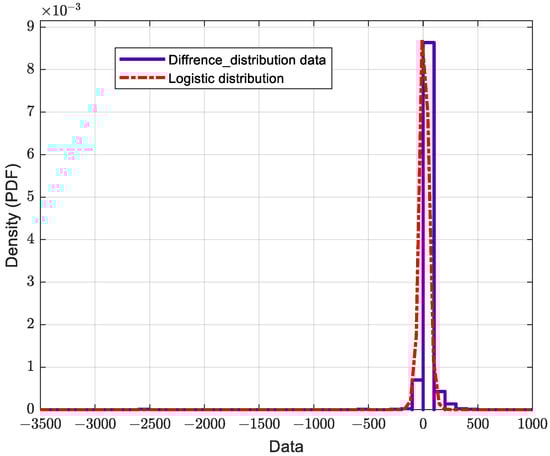 The difference between these two distributions is shown in Figure 16. It is clear that this difference represents a logistic distribution. The mean and variance of the actual phase shifters are 46.997 and 481.359 respectively, whereas the mean and variance of the ideal phase shifters are 36.4697, and 10.4387 respectively. Table 3 shows the other parameterizations of the estimated distributions with more details. In this table, µ refers to mean for logistic distribution and to mean of logarithmic values for log-logistic distribution.