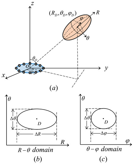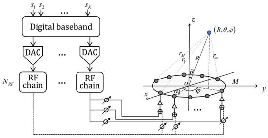 The target user locates at point , i.e., in Cartesian coordinate system, where represent the distance (to the center of UCA), elevation angle and azimuth angle, respectively. The location of the m-th antenna of UCA with a radius of is denoted by , where and is the angle between two adjacent antennas.