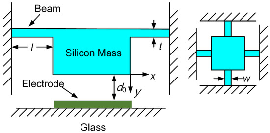 The schematic diagram of the tester is shown in Figure 1. The tester consists of an electrode on a glass substrate and a mass supported by four guided cantilever beams (FGCBs), and a piezoresistive Wheatstone bridge is integrated on the beams. The movable mass can be driven by the driving voltage between the mass and the electrode. In the previous research on the pull-in phenomenon, fixed–fixed beams [17] and cantilever beams [18] were usually used. These models are hard to solve analytically due to changes in the plate angle and electric field distribution. FGCBs have a simpler and more accurate mechanical model because the bottom of the mass is always parallel to the electrode on the glass substrate. Moreover, when applying a lateral force (10% of the restoring force during pull-in) to a cantilever beam, a fixed–fixed beam, and our structure with the same feature sizes, the first principal stress on the FCGBs is the smallest, as shown in Figure 2. Therefore, FGCBs can effectively resist lateral perturbance through accidental factors near the critical point. Since the stiffness of the glass substrate is high enough and the four beams have good elasticity, it is believed that the glass is nondeformable, and that the change in the gap is only caused by mass movement. Further, it can be approximated that there is no deformation in the mass area because its thickness is much larger than that of the beams. Due to the symmetry of the structure, the movement of the mass is translation along the y direction.