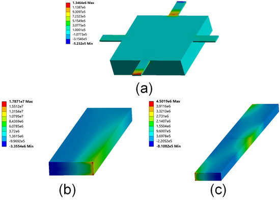 The first principal stress cloud diagram when applying a lateral force (surface load) to the (a) FGCB structure (mass underside), (b) cantilever beam (free end), and (c) fixed-fixed beam (middle section) of the same geometric sizes.