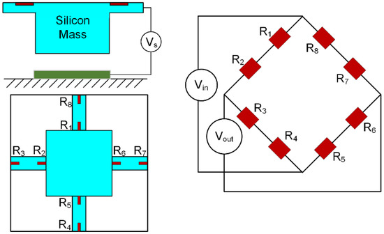 In this experiment, because the maximum tensile stress on the beam is generated at the fixed end and the maximum compressive stress is generated at the guided end when the mass moves, two piezoresistors were designed both at the guided and fixed ends of each beam, as shown in Figure 3. The stress is symmetrical at both ends [19]. The eight piezoresistors are connected to form a Wheatstone bridge, and the circuit connection of the whole system is shown in Figure 4. The initial resistance values of the eight resistors are equal for the same manufacturing process. The typical value for the resistors is 1.4 kΩ. During the deformation, the change in R1, R2, R5, and R6 is ΔR1, and the change in R3, R4, R7, and R8 is ΔR2. For actual results, it is difficult to ensure that the stresses in the tensile zone and compression zone are exactly the same. Combined with the expression of the bridge, the output voltage Vout of the tester is