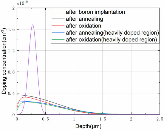 Process parameters, such as the dose and energy of the dopant, temperature and time of annealing, and thermal oxidation conditions, will affect the distribution of the doping concentration; different doping concentrations determine different piezoresistive coefficients. In order to study the correlation between the process parameters and piezoresistive coefficient, first, the SPROCESS module of the process and the device simulation tool Sentaurus TCAD were used to establish the correlation between the process parameters and the doping concentration distribution. In the following, the calculation method of the piezoresistive coefficient based on the doping concentration distribution is discussed.