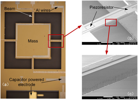 The structure of the tester was manufactured following the standard bulk silicon piezoresistive process of Peking University, which possesses the following characteristics: (1) MEMS piezoresistive sensors can be manufactured; (2) suspended beam structures can be manufactured; and (3) the process flow is compatible with mainstream MEMS manufacturing processes, and it is easy to extend to large-scale production lines. First, we used the ion implantation process to create the piezoresistive area and heavily doped area. Then, the KOH etching process was performed twice to form the mass and capacitor gap. Additionally, the circuit was formed via Al (aluminum) sputtering and the lift-off process. The last step was deep reactive ion etching to release the silicon structure, thereby achieving the manufacture of the MEMS suspension structure, FGCBs. The entire structure was bonded to the glass. Photographs of the fabricated tester are shown in Figure 7. The process flow is shown in Figure 8.