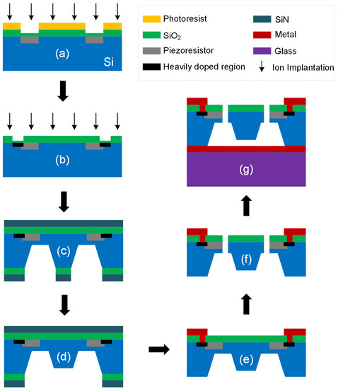 Our tester was manufactured together with the MEMS device under the same process. The conditions of the standard bulk silicon piezoresistance process of Peking University are as follows: boron ion implantation is performed at a concentration of 3 × 1014 cm−2 and an implantation energy of 100 keV to form piezoresistors. Then, annealing at 1100 °C/120 min and oxidation at 1000 °C/37 min are carried out. The heavily doped connection region is prepared via boron diffusion to realize an effective ohmic contact. These are used to calculate the theoretical piezoresistive coefficient in Section 5.2.