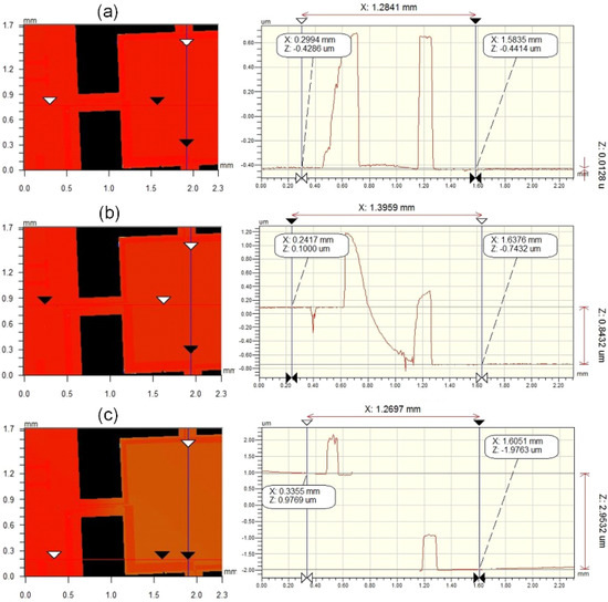 Pull-in process observed by optical profiler. (a) When the driving voltage was 0 V, the step height was 12.8 nm, and it was considered that the mass had no downward displacement. (b) When the driving voltage was 71.0 V, the step height increased to 843.2 nm. (c) When the driving voltage was 71.2 V, pull-in occurred, and the step height was 2.95 μm. Therefore, the minimum value of the pull-in voltage Vpmin of this structure was 71.2 V (the accuracy was within 0.2 V).