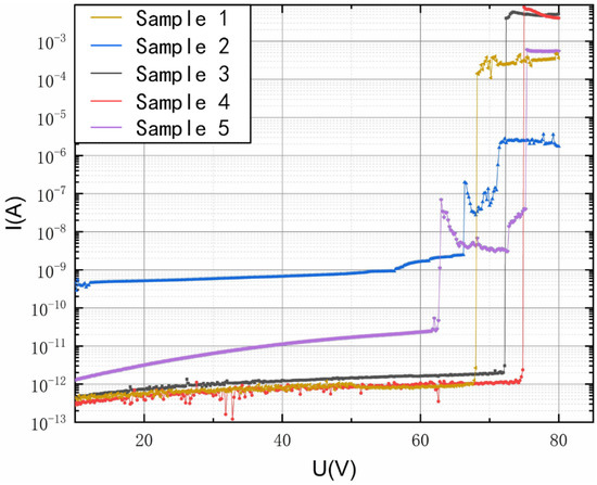 Combined with the tester sizes, the average of the effective stiffness Keff was 3590.74 N/m, and the “effective Young modulus” was calculated to be 166.2 GPa using Equation (2). The maximum deviation of the measurement was 392.14 N/m. The deviation percentage was 10.92%. The test demonstrated good repeatability. The results show that the experimental value was 1.66% lower than the 169 GPa of the macroscopic bulk silicon material [24]. Possible causes include the heat treatment and surface defects. The results reflect the influence of the process on the mechanical properties and, at the same time, present the process uniformity on the wafer. The effective stiffness of the beam was extracted, which is of great significance for the design of high-reliability MEMS devices.