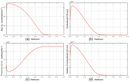 (a) Doping concentration distribution under our process obtained via SPROCESS simulation. The distribution of the piezoresistive electrical parameters in depth is also shown: (b) conductance; (c) piezoresistive coefficient; (d) variation in conductance under unit stress.
