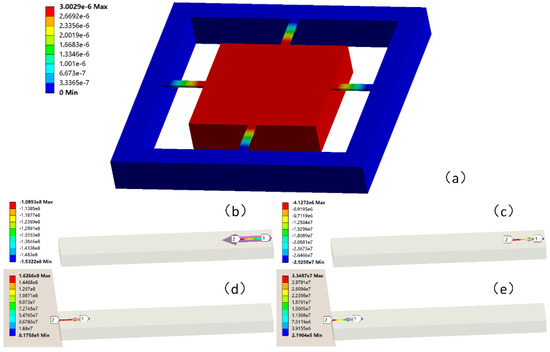 FEM simulation results during pull-in. (a) Total deformation of the tester structure. (b,c) σl and σt in the piezoresistor compression region. (d,e) σl and σt in the piezoresistor tension region.