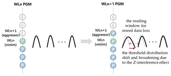 Due to the rapid development of the information era, 3D NAND memory is widely used in various applications to fulfill the explosive growth in data demand due to its good product performance and cost [1,2]. In the future development of 3D NAND, cell pitch shrinkage will be the inevitable and important way to increase storage density [3,4]. There is a prominent, non-ideal effect, called z-interface, in 3D NAND flash memory. The manifestation of this non-ideal effect is that the threshold voltage of the cell WLn (victim) is affected when the cell WLn + 1 (aggressor) is programmed, which manifests as the shift and broadening of the threshold distribution in the array operations, as shown in Figure 1. The reading window for stored data is affected by z-interference. With the cell Lg/Ls shrinkage, z-interference is one of the most critical concerns regarding device reliability [5,6,7]. In this situation, z-interference improvement is of great importance for the development of 3D NAND memory. In addition to process improvement [8], operation schemes have been reported to improve z-interference by adjusting the read voltage (Vread) of adjacent cells during the read operation [9,10,11]. These operation solutions used to improve z-interference mainly increase the WLn + 1 Vread voltage in order to increase the inverse electric field, thus reducing the WLn + 1 pattern’s impact on the channel barrier during WLn reading. However, there is a tradeoff between the read voltage tuning and read disturbance because of the higher Vread of the adjacent cell gate, which is also one of the key reliability requirements of 3D NAND flash [12]. Nevertheless, there are few studies on the improvement of 3D NAND z-interference during the cell programming operation.