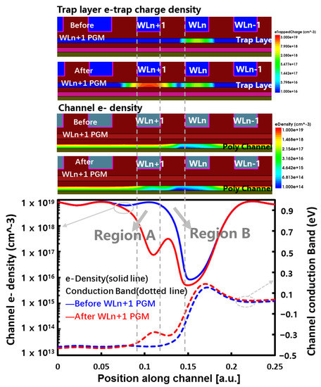In this work, the channel was divided into different regions for z-interference analysis. Figure 2 mainly demonstrates the z-interference mechanism. As shown in Figure 2, the channel potential barrier, which is increased due to adjacent cell programming, can be divided into two regions: Region A and Region B. Region A corresponds to the WLn + 1 cell region. Region B is the inter-cell regime. For Region A, the increase in the channel potential barrier (the peak of the channel conduction band) is inevitable and irrelevant to the program pattern with certain device dimensions. Meanwhile, for Region B, compared with planar 2D NAND devices [23], the inter-cell charge is unique to typical 3D NAND trap charge memory devices, but it is not necessary for the formation of device patterns. It should be noted that z-interference can also be improved by suppressing the influence of Region B, which, to the best of our knowledge, has not yet been clearly studied. This work provides a further analysis of the effect of Region B on z-interference.
