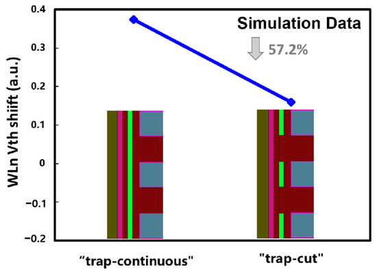 In order to confirm the influence of the Region B electron trap density on z-interference, TCAD simulation was carried out to compare the z-interference between the “trap-continuous” and “trap-cut” structures [24]. As there is no trapping layer between two adjacent cells in the “trap-cut” structure, the z-interference induced by the inter-cell charge is eliminated. The reading of WLn (victim) is affected only by the pattern of WLn + 1 (aggressor). The lower the Vth of WLn (victim), the higher the Vth of WLn + 1 (aggressor), and the greater the change in the channel barrier are, the more apparent the z-interference effect will be. In Figure 3, the simulation data show that the “trap-cut” structure has a 57.2% increase in z-interference as compared with the default “trap-continuous” structure. In other words, as expected, the z-interference can be improved by reducing the impact of the charge in Region B. Based on the above analysis, the trapped electronic charges in Region B are one of the reasons for z-interference in 3D NAND memory.