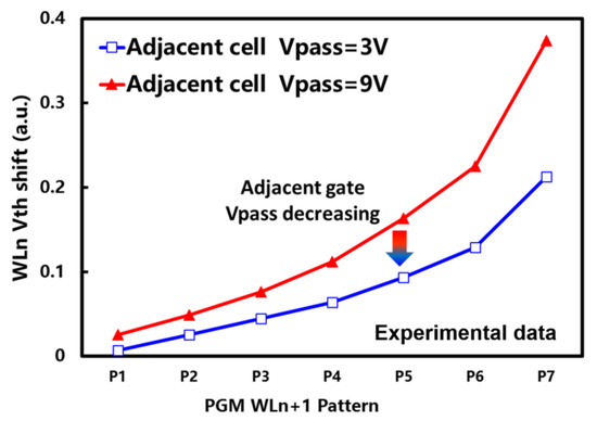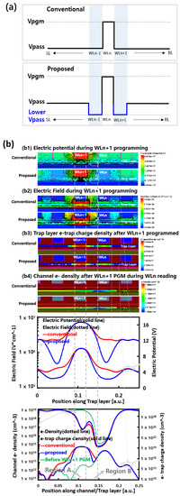 Analyzing the z-interference mechanism of the simulation in Figure 2, it can be observed that when the selected WLn (victim) is read after WLn + 1 (aggressor) has been programmed, the channel inversion electron densities near the target cell are changed. For z-interference improvement, several works have aimed to decrease the channel barrier with operation schemes, but most studies have focused on the adjustment of the neighboring cells’ Vread during the read operation [9,10,11,16,20]. Other researchers have studied schemes of non-selected cells’ Vpass to improve the device characteristics during programming in 3D NAND flash, such as cell Vpass disturbance and PGM disturbance [21,22], but they have not clearly focused on the analysis of the influence of the adjacent cells’ WLn ± 1 Vpass on z-interference during programming. Additionally, there is no study on the components and formation factors of WLn (victim) channel barrier increase that arises during WLn + 1 (aggressor) pattern programming.