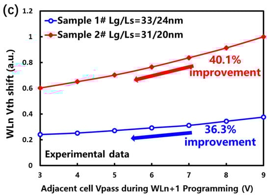 Therefore, there is an optimal condition for adjacent cell Vpass adjustment, considering the program disturbance and z-interference. In Figure 6a, the thick, solid line indicates the net increase in the total Vth shift, which comprehensively considers the z-interference and the program disturbance. With Lg/Ls shrinkage, the optimization point moves to the low-voltage region, which, due to the proportion of z-interference increase, influences the device characteristics’ degradation.
