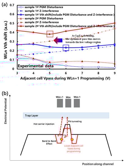 (a) Program disturbance and z-interference inducing Vth shift with different levels of adjacent cell Vpass (the blue lines indicate thicker Lg/Ls device electrical properties; the red lines indicate thinner Lg/Ls device electrical properties). (b) Explanatory diagram of the proposal scheme’s impact on the program disturbance.
