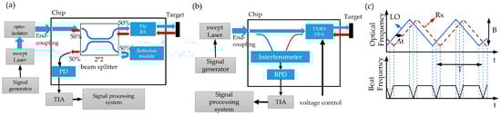 (a) Schematic diagram of on-chip coaxial FMCW LiDAR system built by 2 × 2 beam splitter; (b) schematic diagram of on-chip FMCW LiDAR system with solid-state beam steering by interleaved coaxial optical phased array; (c) ranging principle.