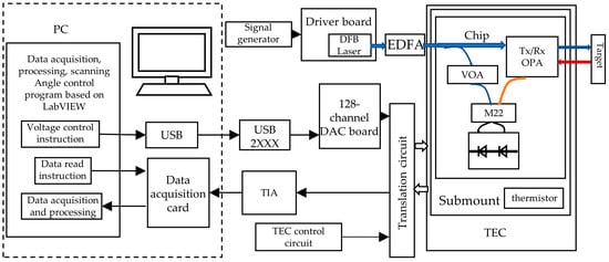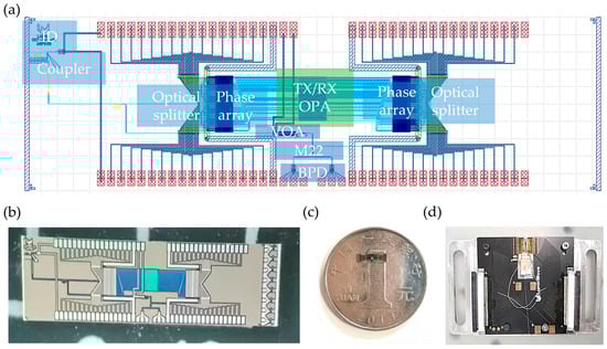 In order to achieve a higher signal intensity, the receiving direction of the receiving array can be adjusted by the phase-shift array, and the intensity of the reference light can be adjusted by the on-chip variable optical attenuator. The system adopts a staggered coaxial transceiver optical phased array design. Compared with a common method using a 2 × 2 beam splitter for such a coaxial configuration, as shown in Figure 1a, this design eliminates the 3 dB loss of the transmitting and saves 50% of the input optical power, in principle, with the same performance. Figure 2b shows an optical micrograph of the chip. Figure 2c shows the actual picture of the chip placed on a one yuan coin, and the corresponding overall size of the chip is 7.1 mm × 2 mm. The photonic chip (Figure 2c) is fabricated on an SOI (silicon-on-insulator) platform with 2 µm buried oxide and 220 nm top silicon by Advanced Micro Foundry (AMF) (Singapore). As shown in Figure 2d, the optical fiber block is pasted on the substrate to realize optical packaging. Electrical packaging is carried out at the same time. There are a total of 70 electrical packaging channels, 64 channels of which are used to control the direction of the phased array of transmission and reception, 3 electrical channels are used for the signal, offset, and grounding of the balance detector, 1 channel is used to adjust the adjustable attenuator to achieve the reference light intensity change, 1 electrical channel is used to monitor the coupling efficiency, and 1 electrical channel is grounded.