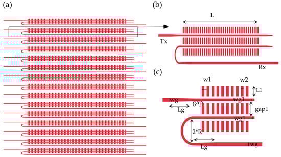 The interleaved coaxial antenna is made of silicon waveguide and periodic nano-blocks. Light will form an evanescent field around the waveguide, and the nano-blocks periodically perturb the evanescent fields to form a weak-radiating grating, leading to a long effective radiation length required for highly directive optical phased arrays. The silicon waveguide is designed for a narrow waveguide, which makes the evanescent field larger. A trapezoidal mode size converter is used to connect the ordinary waveguide and the narrow waveguide. The design parameters of the antenna mainly include the period number of the periodic nano-blocks, period length w1, duty cycle w2/w1, the etching depth of the periodic nano-blocks, the gap between the nano-blocks and the waveguide, the width of the nano-blocks L1, the width of the waveguide wg1, the gap between the transmitting waveguide and the receiving waveguide gap1, the bending radius R, etc. The period of the nano-blocks determines the deflection angle of the antenna. The emitter–receiver efficiency is determined by the etching depth, duty cycle, grating width, antenna interval, and antenna period number. In addition, the number of periods of the periodic nano-blocks also determines the antenna size.