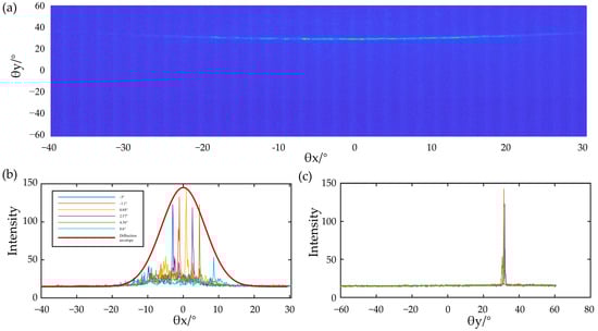 (a) Far-field distribution of the optical phased array when the emission optical phased array is not voltage applied to the phase shifter; (b) beam steering results by adjusting the phase shifters. Several scanned far-field intensity distributions in θx direction represented by different colors; (c) corresponding far-field distribution in θy direction.