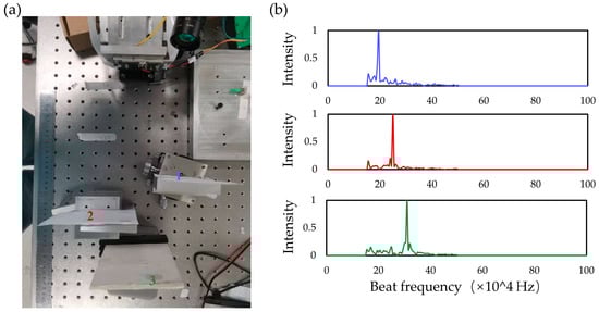 The on-chip solid-state FMCW LiDAR testing system is shown in Figure 6. The single-lobe beam and its beam angle of the optical phased array on the LiDAR chip were controlled by adjusting the voltages, thus changing the phases of the antennas. The beam forming of the transmitting OPA was obtained first followed by maximizing the received power of the receiving OPA to ensure the coincidence of the beam angle of both arrays. The mixed photocurrent signal from the balanced photodetector was amplified by the transimpedance amplifier and read out by an acquisition card. Fourier transform was performed on the obtained signal to obtain the beat frequency and the corresponding distance was calculated. In this test, the central wavelength of the laser is 1550 nm, the frequency modulation bandwidth is 5 GHz, the modulation period is 15 KHz, the optical power is 100 mw, and the reflectance of the target is 90%. The range error is mainly affected by the modulation bandwidth. The ranging accuracy is about 1.5 cm. Three targets with different distances and angles are shown in Figure 7a, where the target is a highly reflective cooperative target. The voltage of the transmitting and receiving OPA is controlled synchronously to make the beam deflect to the position of the three targets and acquire the corresponding signals of different targets. The spectrum signals corresponding to different targets are shown in Figure 7b. The peak frequencies are 0.195 MHz, 0.25 MHz, and 0.31 MHz, respectively, and the corresponding test distances of the signals are 18 cm, 24 cm, and 30 cm, respectively, which are consistent with the actual distance results. There is slight crosstalk between the receiving array and the transmitting array, part of the light is directly coupled from the transmitting array into the receiving array, so there are low-frequency signals present. Moreover, the signal frequency value of the target is always large due to the long distance of the actual test. Therefore, we filter the low-frequency signals when processing the data, which will not have too much influence on the ranging.