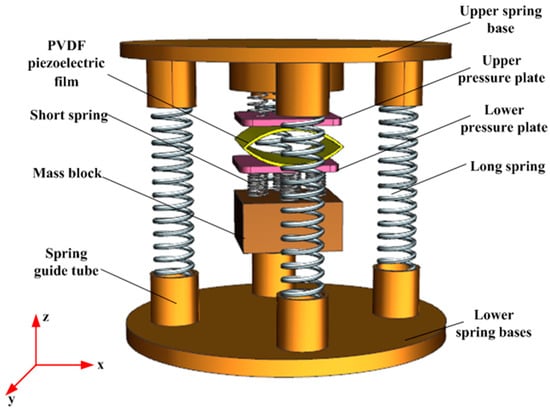 The three-dimensional structure of the impact piezoelectric energy capture device is shown in Figure 1. The piezoelectric film (polyvinylidene fluoride) adopts a double-arch structure, which can be placed by two or more upper and lower connections, and each PVDF piezoelectric film has the same structural parameters. The upper and lower pressure plates of the arch-shaped PVDF piezoelectric film are connected to each other by four short springs, and the upper and lower pressure plates and the piezoelectric film are fixed by epoxy resin adhesive. The mass block is connected to the lower pressure plate by a short spring, and the upper spring base is connected to the lower spring base by four long springs placed in the spring guide tube of the device.