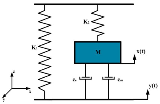 When an impact piezoelectric energy trap is externally excited, the trap is viewed as a spring-mass-damping dynamics model, as shown in Figure 3. Where is the mass of the mass block, the piezoelectric film, and the pressure plate, the damping is set to , the mechanical damping between the piezoelectric film and the pressure plate is set to , the system damping of the captive energy device during vibration is , and the equivalent stiffness of the spring is .