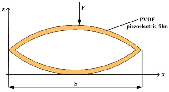 where is the stress in the -direction, is the Young’s modulus of the PVDF piezoelectric film, is the strain in the x-direction (, is the radius of curvature), is the potential shift of the piezoelectric film in the -direction, is the piezoelectric constant, is the electric field strength of the piezoelectric film, and is the dielectric isolation rate.