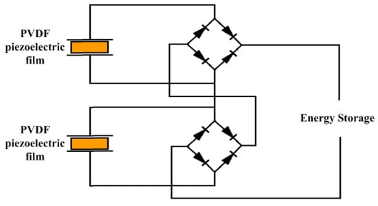 In order to make the power generation module with higher power generation performance, the power generation module in this experimental setup consists of two arch-shaped PVDF piezoelectric films assembled in series. When PVDF piezoelectric film is subjected to the action of external force , the voltage and current of its piezoelectric film have alternating characteristics, and we need a regulated power supply for charging the electrical appliances around us in daily life, so we have to rectify it. The rectification circuit will avoid the phenomenon that the PVDF piezoelectric film of high voltage charges the PVDF piezoelectric film of low voltage and its circuit diagram when the PVDF piezoelectric film is connected in series, as shown in Figure 5.